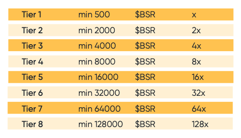 We also have additional BSR rewards for our long term stakers. Reward is 1/1000 of the minimum BSR staking amount of users existing Tier at the time of distribution. First distribution is done after 150 days in staking for a new user and they continue to receive a loyalty bonus every 150 days till they start the unstake process no matter which Tier they are in.